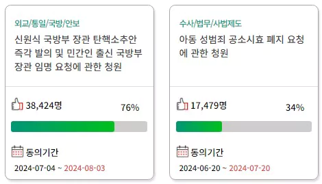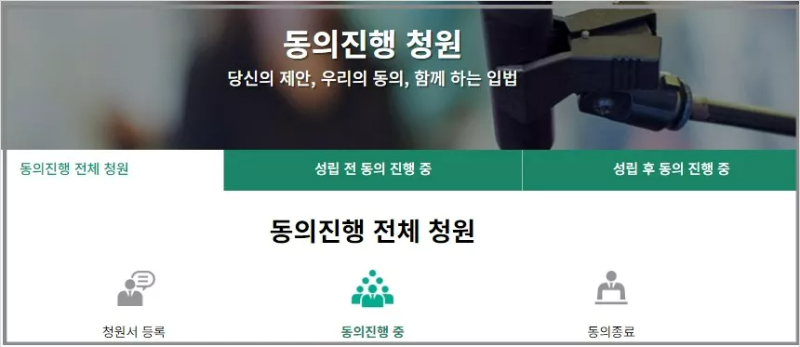 동의가 진행 중인 국민청원 역시 홈페이지에서 바로 확인할 수 있습니다. 또한 동의가 종료된 청원도 확인할 수 있습니다.
