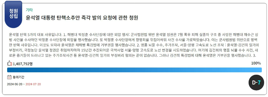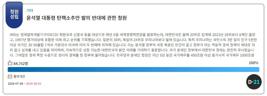 현재 국민청원 홈페이지를 방문하면 윤석열 대통령 탄핵과 관련한 국민청원이 진행중인 것을 확인할 수 있습니다. 대통령 탄핵을 요청하는 청원과 탄핵을 반대하는 청원이 동시에 진행중입니다.