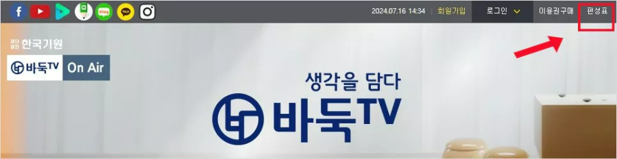 바둑 TV는 편성표는 바둑 TV홈페이지 우측 맨 위에 있습니다.