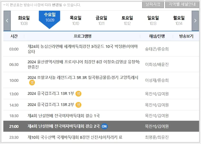 편성표를 클릭하면 날짜별 편성표를 바로 볼 수 있습니다. 또한 지역별로 방송되는 바둑TV 방송 채널 번호도 확인할 수 있습니다. 아래 링크를 클릭하시면 바둑 TV편성표로 이동합니다.