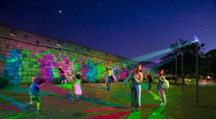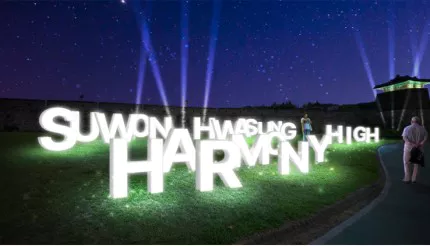 장안공원의 성곽을 따라 펼쳐지는 '미디어로드'는 라이팅아트와 레이저아트 등 다양한 미디어아트로 구성된 산책로입니다. 화성어차 도로를 걸으며 빛으로 수놓은 아름다운 풍경을 감상할 수 있습니다.