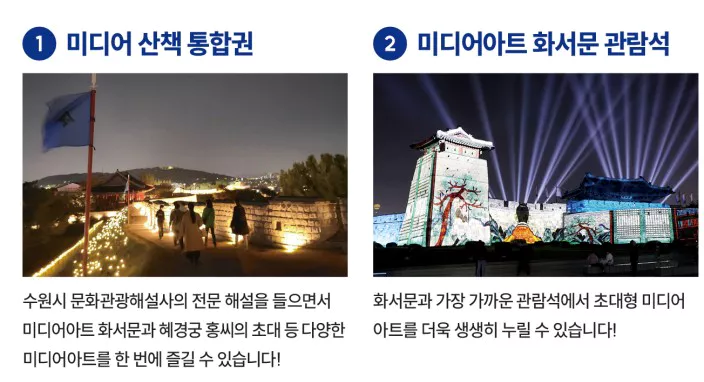 미디어산책 통합권은 수원시 문화관광해설사의 해설을 들으면서 미디어아트 화서문 하모니 하이와 혜경궁 홍 씨의 테이블 맵핑 프로그램 등을 모두 한 번에 즐길 수 있는 프로그램입니다.