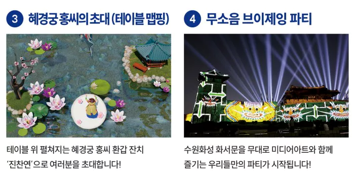 '혜경궁 홍 씨의 초대'는 정조대왕이 그의 어머니 혜경궁 홍 씨를 위해 준비한 진찬연(환갑잔치)을 모티브로 한 테이블 맵핑 프로그램입니다. 미디어를 통해 궁중병과의 의미를 새롭게 느끼고, 과거의 찬란한 궁중 문화를 가까이에서 체험할 수 있습니다.