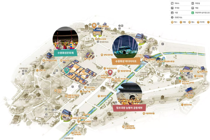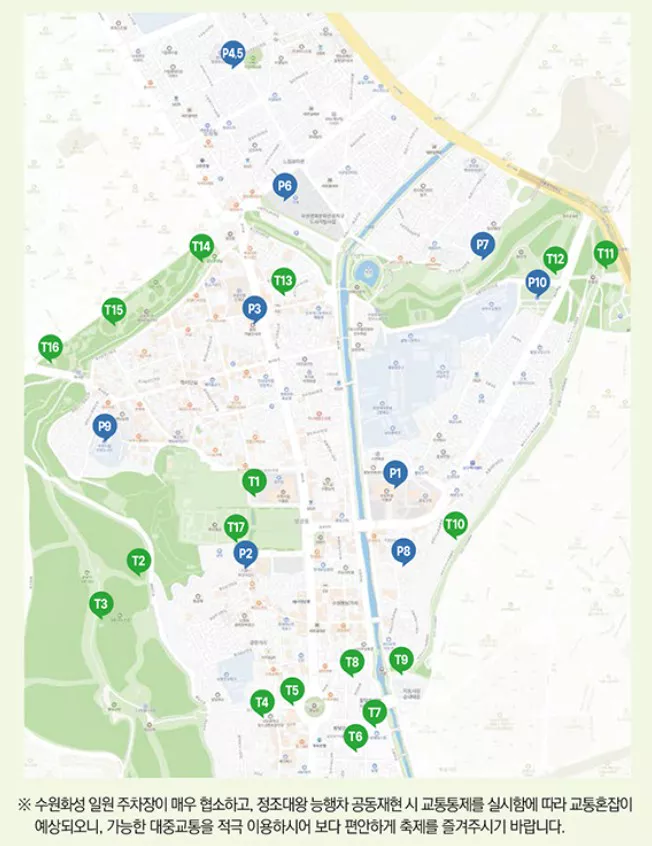 수원화성은 대중교통으로도 쉽게 접근할 수 있으며, 행사장 근처에 다양한 시설이 갖춰져 있어 방문이 편리합니다.