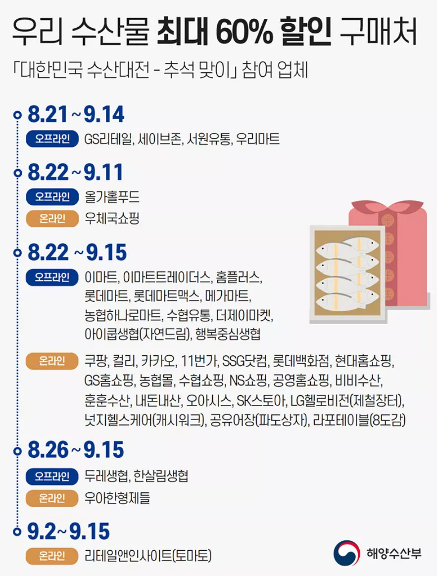 추석맞이 수산물 할인 행사는 다양한 오프라인 및 온라인 유통망에서 진행되며, 각 기간에 맞춰 다양한 참여처에서 수산물을 저렴하게 구매할 수 있는 기회입니다. 이용할 수 있는 곳이 다양하니 잘 활용해 보시기 바랍니다.