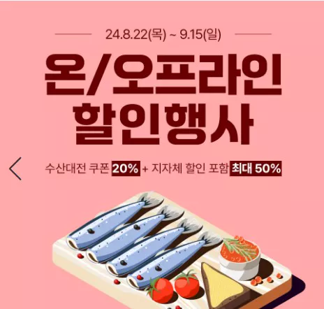 온/오프라인 매장에서 수산물 할인쿠폰을 발행합니다. 상당히 다양한 업체가 참여하기 때문에 선택하기에 좋고, 기존에 이용하시던 업체에서 할인받아 이용하기 좋습니다.
