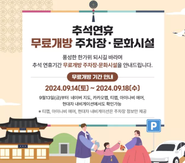 모처럼 긴 연휴로 여유 있게 추석 명절을 보낼 수 있게 되었습니다. 가까운 곳으로 나들이할 때 무료 주차장과 고궁 등 무료입장을 확인하시고 알차게 이용하시기 바랍니다.