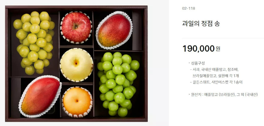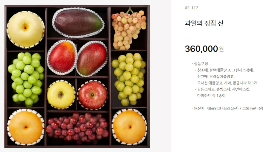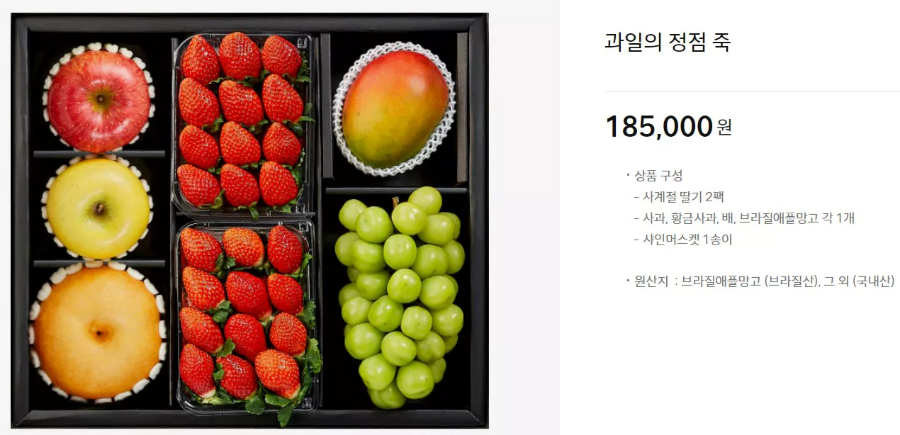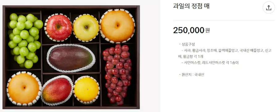 또한, 가격대별로 '과일의 정점 매(梅) 세트'와 '난(蘭) 세트'도 함께 출시되었습니다. 이 세트들은 각각 25만원과 21만 원에 판매됩니다.
