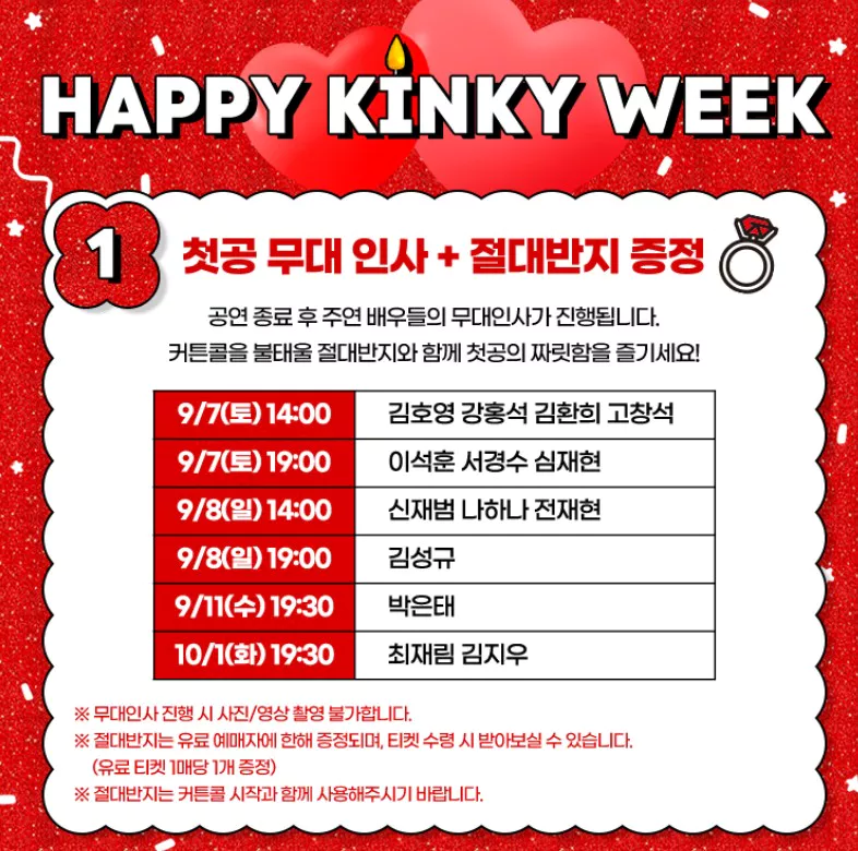• 10월 2일(수): 7시 30분 단 1회 공연 (2시 30분 공연 없음).