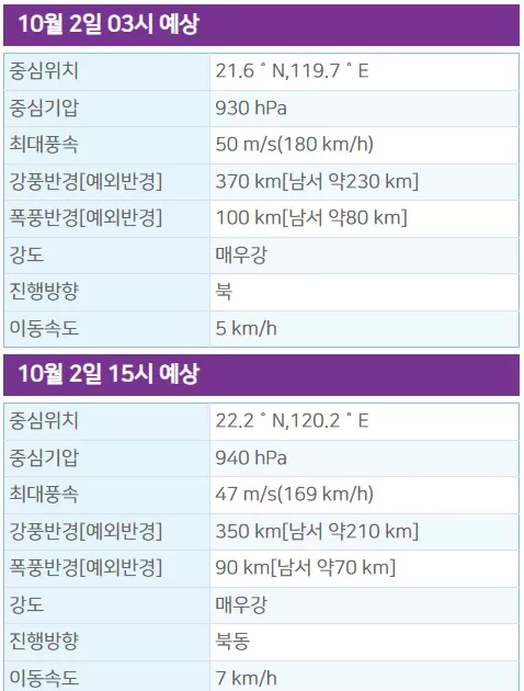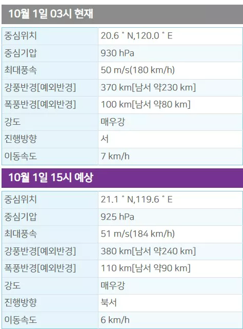 기상청이 발표한 태풍 끄라톤의 강도와 진행방향, 이동 속도와 최대 풍속이 표로 정리되어 있습니다. 태풍의 강도는 매우 강으로 확인되며, 태풍의 방향은 조금씩의 변화가 예상되기 때문에 좀 더 지켜봐야 할 것으로 보입니다.