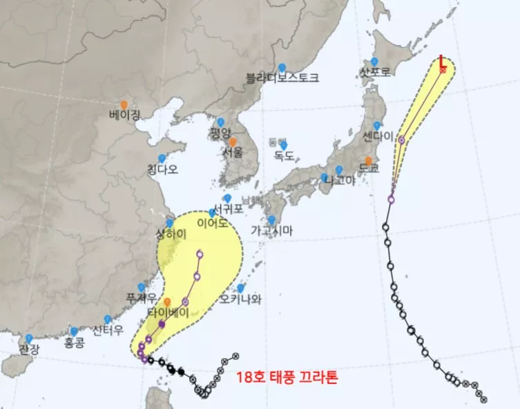 태풍 끄라톤은 2일 타이완에 상륙하거나 그 근처를 스치면서 방향을 북동쪽으로 틀 예정입니다. 원래 예상은 한반도 쪽으로 방향을 틀 것으로 관측되었는데 현재는 동중국해 쪽으로 이동할 것으로 보인다고 기상청이 밝혔습니다.