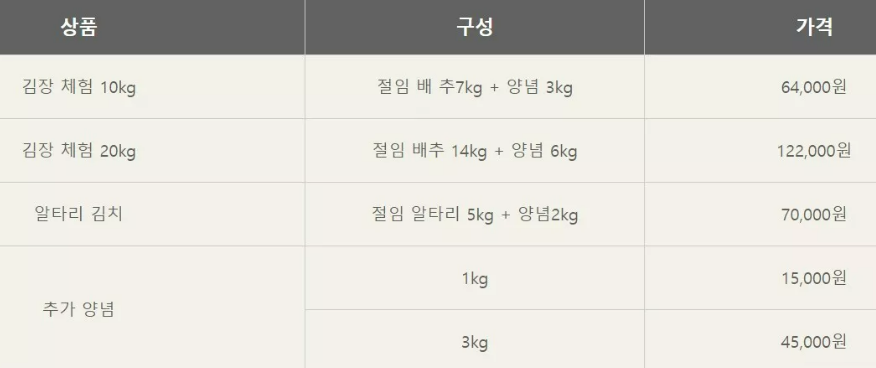 참여 방법은 매우 간단합니다. 사전 예약을 통해 김장 체험에 참여할 수 있으며, 현장에서도 일부 프로그램에 참여할 수 있습니다. 아래표는 김장체험 가격입니다. 김장 10kg을 69000원에 담글 수 있다니 상당히 매력적이네요.