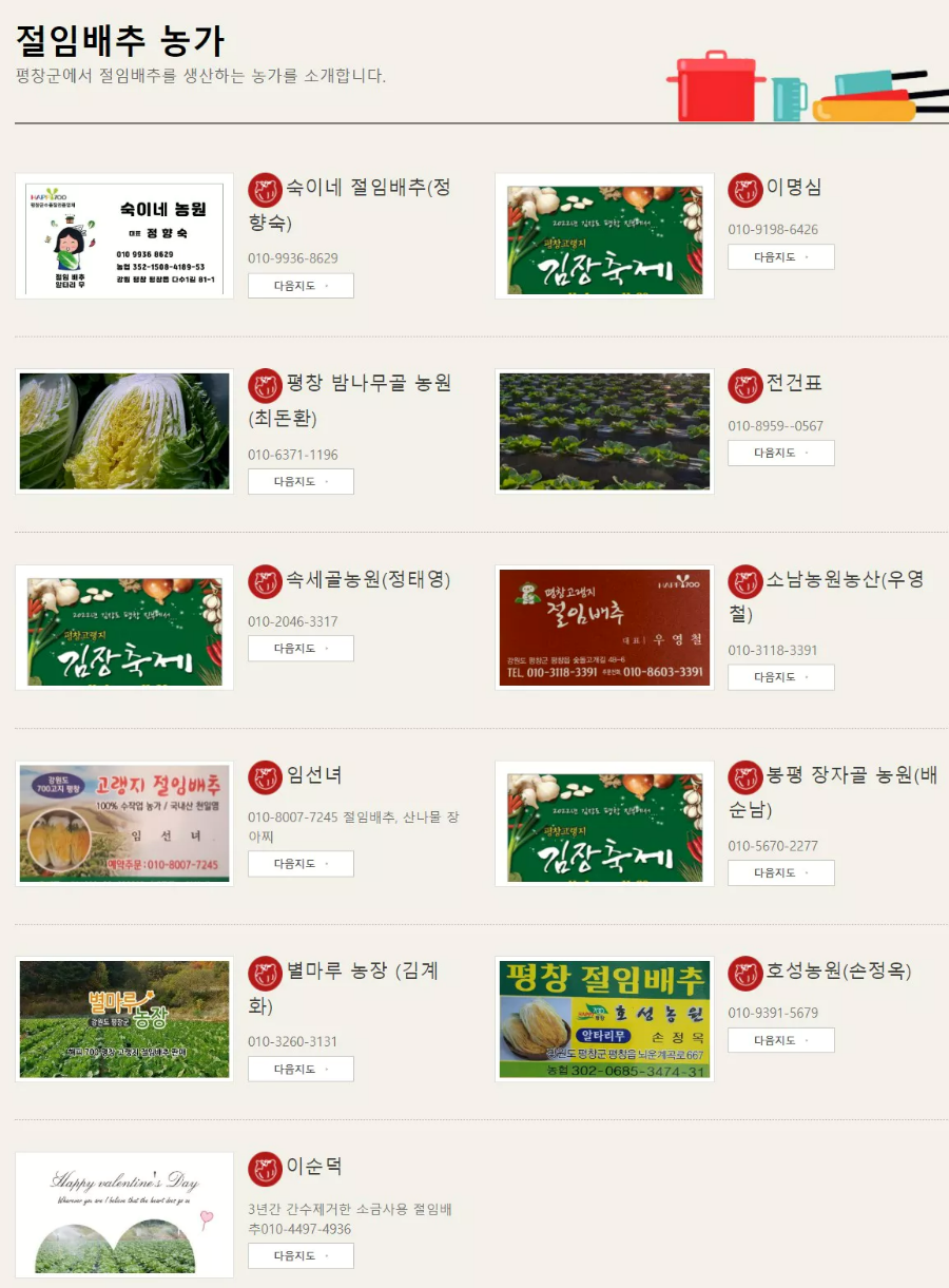 평창김장축제 홈페이지에서는 평창의 절임배추 농가도 소개하고 있습니다. 아래 화면을 참고하시면 됩니다. 절임배추 농가 클릭하시면 자세한 안내를 보실 수 있습니다.
