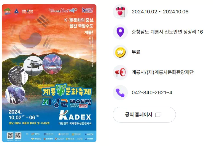 국방의 도시에서 펼쳐지는 웅장한 퍼포먼스 계룡 군문화축제는 군문화를 주제로 한 독특한 축제입니다. 대한민국 군대의 역사와 문화를 체험할 수 있는 이 축제는 계룡시에서 매년 열리며, 군악대 공연, 탱크와 헬기 등의 군사장비 전시, 군복 체험 등 다양한 프로그램이 마련됩니다.