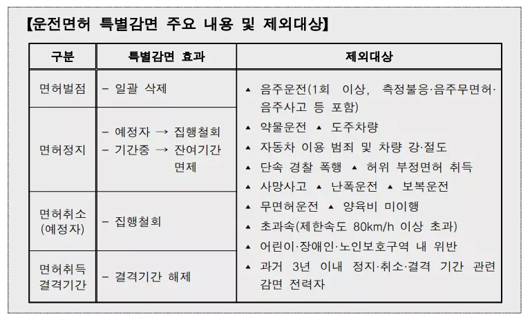 • 운전면허: 총 416,847명의 운전면허 관련 행정제재 대상자가 감면을 받았으며, 이로 인해 생업에 종사하는 서민들의 부담을 덜어주었습니다. 단, 음주운전 등 특별감면 제외 대상도 있습니다.