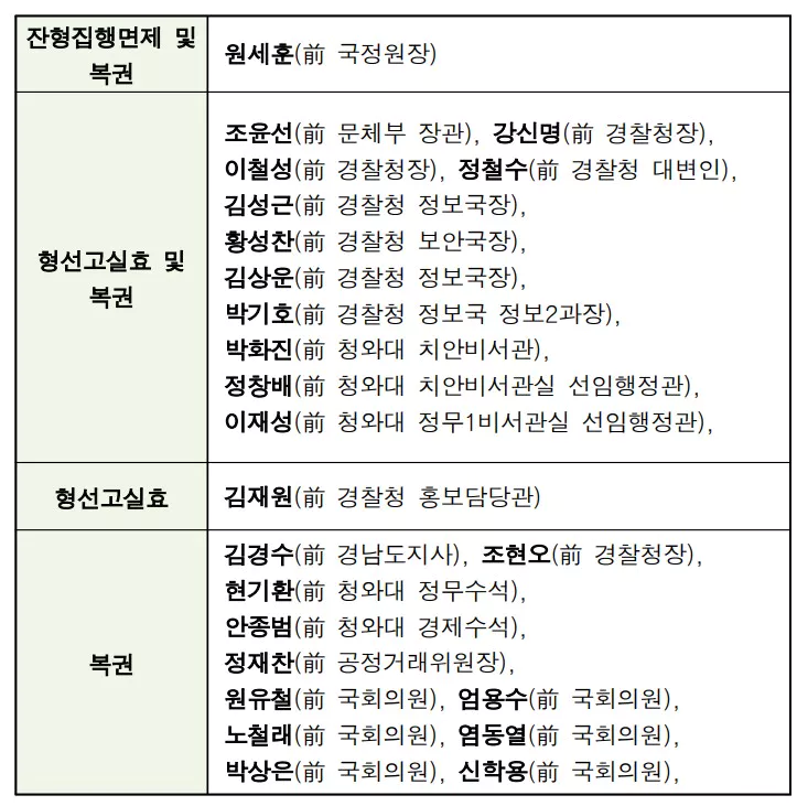 • 전직 주요 공직자 및 정치인: 국가와 사회를 위해 헌신한 전직 공직자와 정치인 55명이 사면되었습니다.