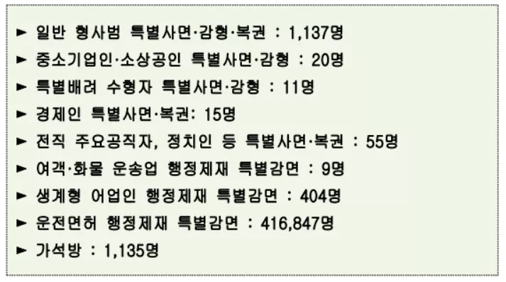 이번 조치를 통해 총 1,219명이 특별사면을 받았으며, 여객·화물 운송업 및 생계형 어업 종사자, 운전면허 등 행정 제재 대상자 417,260명에 대한 특별감면 조치도 함께 시행되었습니다.